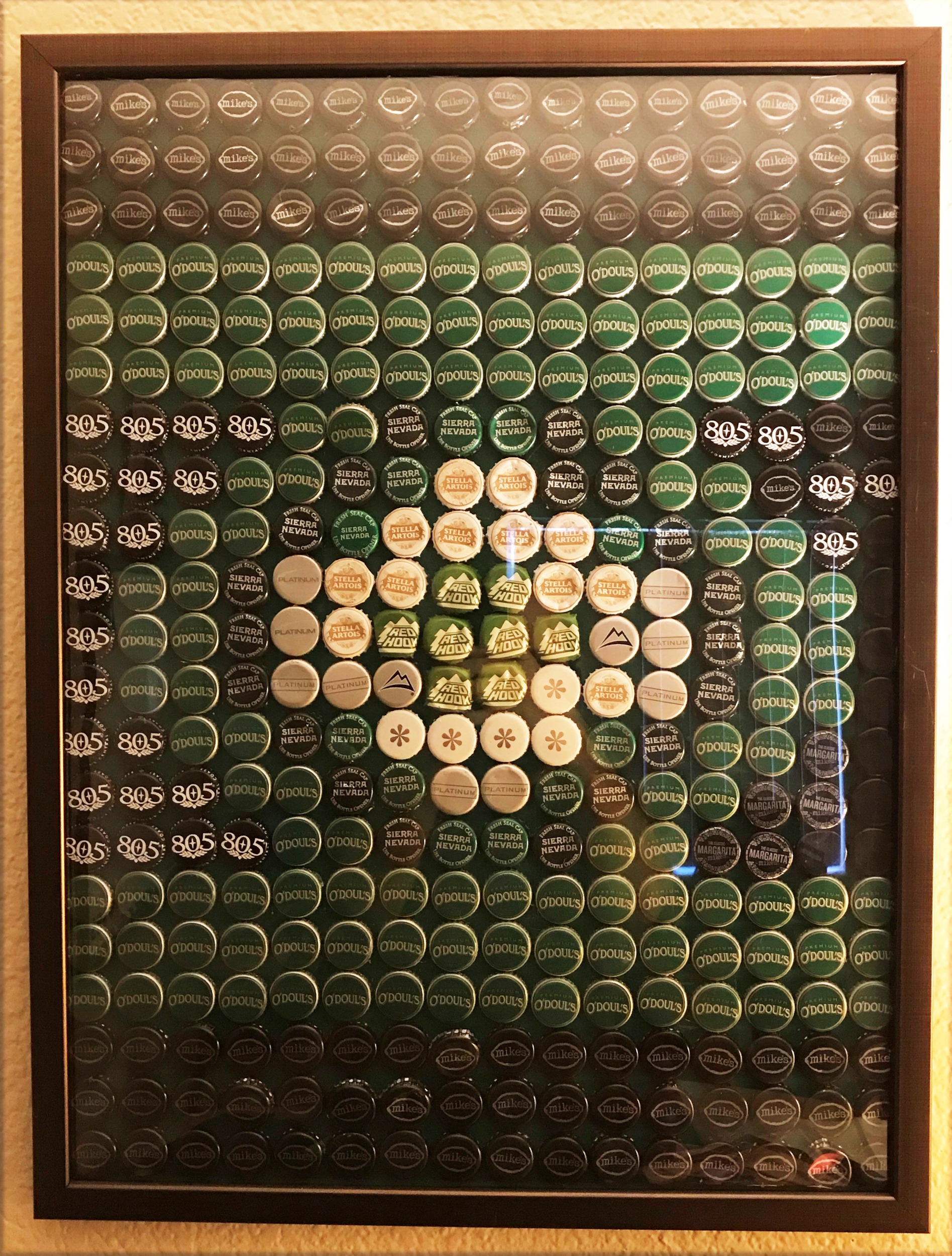 Containing approximately 336 bottle caps, I came up with the idea for this mosaic after creating some horse shoe wind chime crafts. Even though it was great to create some small projects, I wanted to attempt a mosaic with caps already in my collection. A family friend has been donating O’Douls caps for a long time, so there was a plethora of green to work with. I put my organizing and color skills to use creating a display piece to show my love for the logo of the Green Lantern by DC Comics.